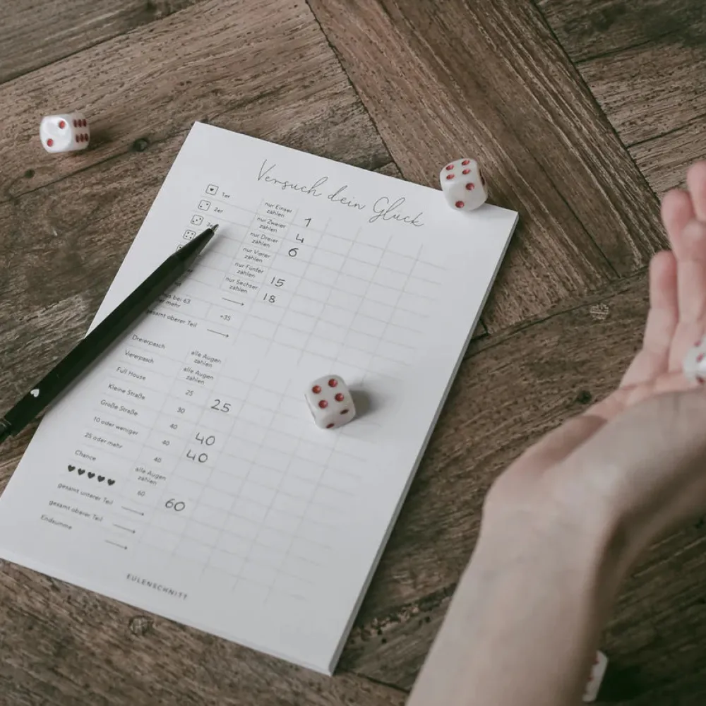 Liebst du es, dein Glück herauszufordern? Dann ist unser Versuch dein Glück Spielblock genau das Richtige für dich! Wir haben das klassische Kniffel-Spiel ein wenig umgestaltet und ihm unser einzigartiges Eulenschnitt Feeling verliehen. Perfekt für Spielabende oder ein kurzweiliges Match beim Kaffee-Date.Diese Spielblöcke sind nicht nur eine großartige Ergänzung für deine Papeterie-Sammlung, sondern auch das perfekte Geschenk für alle, die Spiele lieben. Hol dir jetzt das Eulenschnitt Feeling in Form von spannenden Spielen!Merkmale:50 BlattLeimbindungVerstärkte Rückwand aus PappeMaße:Format DIN A5 (14,8 x 21 cm)Material:Weißes Papier mit schwarzem Print