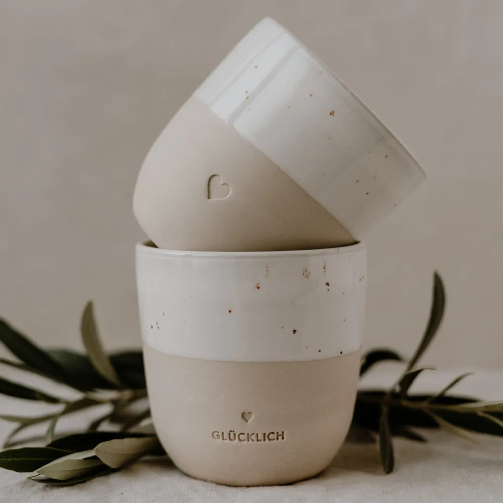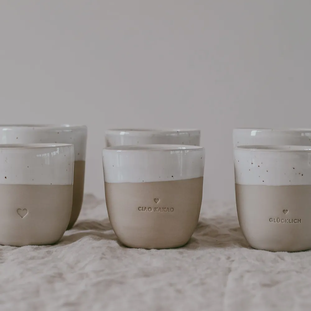 Unsere Becher Familie hat Zuwachs bekommen – Wir freuen uns so, dass es nun auch unseren Kleinen Becher Herz gibt. Perfekt für jeden, der sich schon immer eine etwas kleinere Größe des beliebten Steingut Bechers Herz für seinen Cappuccino oder Flat White gewünscht hat!Wir haben sehr viel Herzblut in eine neue Kollektion gesteckt, die von der Form, dem Ton, dem Glazing, sowie dem Design von uns entwickelt wurde. Eine kleine Töpferei aus Portugal produziert diese wundervollen Becher in liebevoller Handarbeit u0026amp; ist ein großartiger neuer Begleiter auf unserem kreativen Weg. Unsere Becher lassen die Herzen höher schlagen, die die Individualität von Ton u0026amp; Glasur lieben, denn jeder einzelne Becher hat seinen ganz eigenen Touch. Da alle Becher mit der Hand gefertigt, gebrannt, geprägt, abgeschliffen, geglazt u0026amp; nochmal gebrannt werden, gibt es Unterschiede in der Drucktiefe, in der Höhe sowie der Geradlinigkeit. Das minimalistische Design und die natürlichen Farbnuancen werden von einer wunderschönen Herz Blindprägung abgerundet. Wir sind verliebt u0026amp; voller purer Freude u0026amp; können es kaum abwarten unsere neue Kollektion in Euren Händen zu sehen! Material:SteingutPflegehinweis:SpülmaschinenfestMaßeHöhe: ca. 8 cmDurchmesser: ca. 8 cmFüllmengeca. 200mlPhotocredits: Dieses Produkt hat unsere liebe Maggy für uns abgelichtet