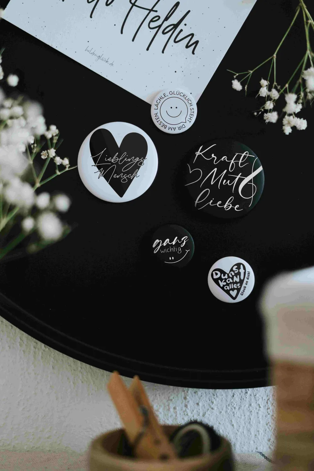 Entdecke unseren kleinen Magnet mit dem Spruch „Du kannst alles, glaub an dich“. Perfekt als motivierendes Geschenk, um jemanden zu ermutigen und zu inspirieren. Ideal für den Kühlschrank, das Büro oder jeden anderen magnetischen Untergrund.Details Größe: 32 mm Durchmesser Matt und samtweich Design: Spruch oder Illustration in Schwarz-Weiß Perfekt für den Kühlschrank oder die Pinnwand