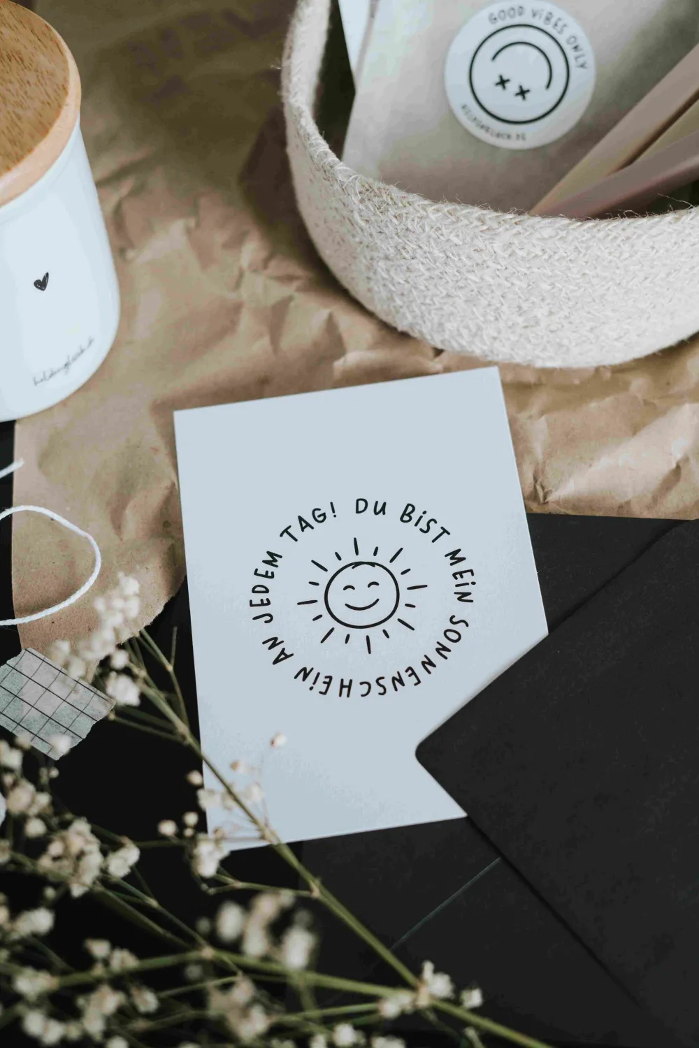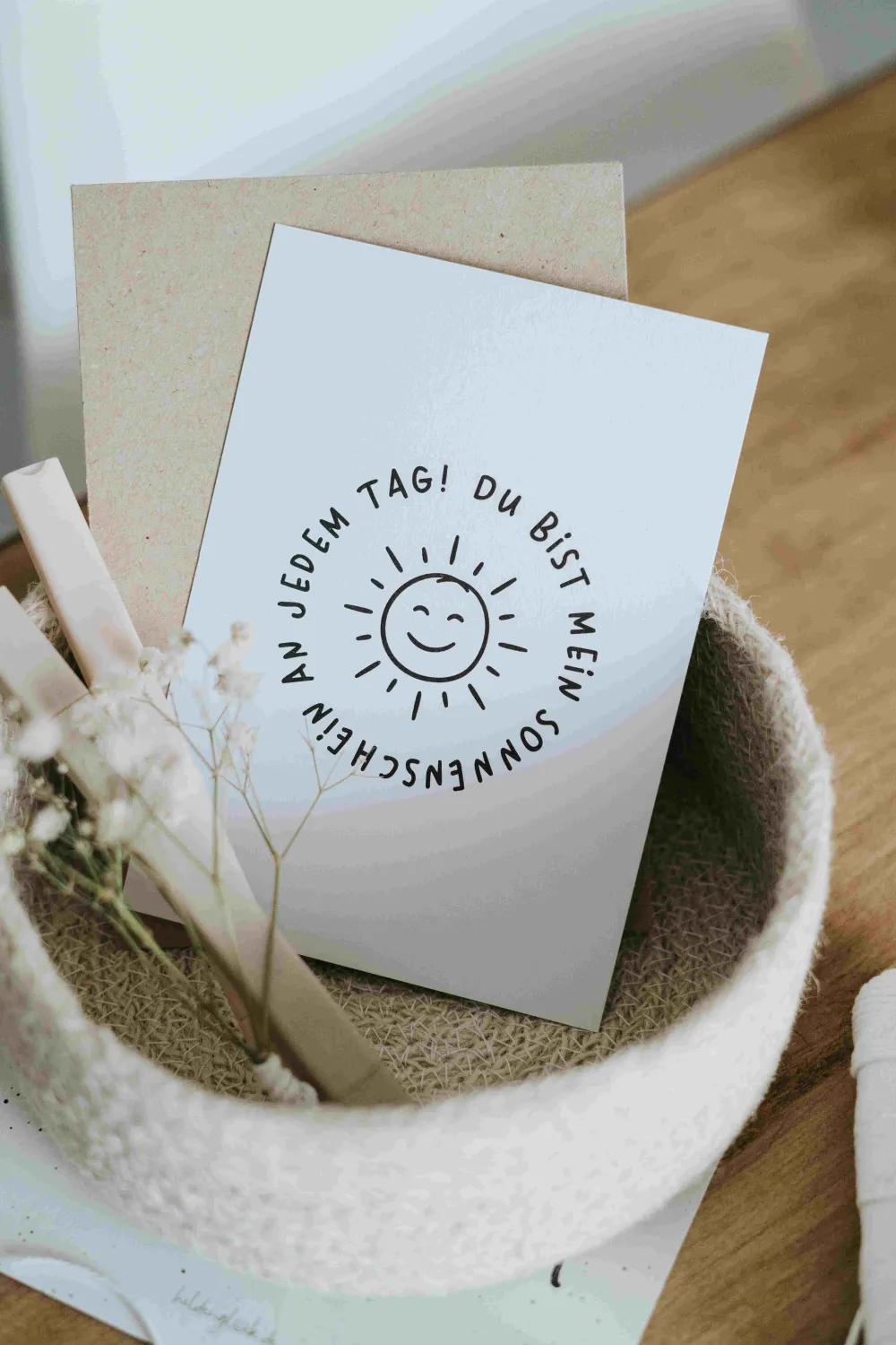 Unsere stilvolle Postkarte mit dem Spruch „Du bist mein Sonnenschein an jedem Tag!“ ist das perfekte Geschenk, um Liebe und Freude zu verbreiten. Format: Hochwertige A6-Postkarte Material: 400g Naturpapier Aufdruck: „Du bist mein Sonnenschein an jedem Tag!“ Universell: Tolles Geschenk für jedes AlterDiese Karte, aus nachhaltigen Materialien und mit modernem Design, bringt ein Lächeln in den Alltag deiner Herzensmenschen. Zeige ihnen, wie wichtig sie dir sind und erinnere sie daran, dass sie dein täglicher Sonnenschein sind.