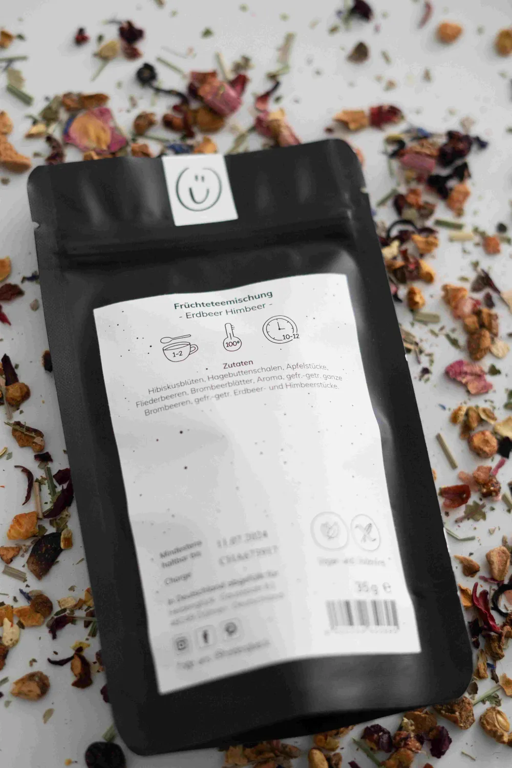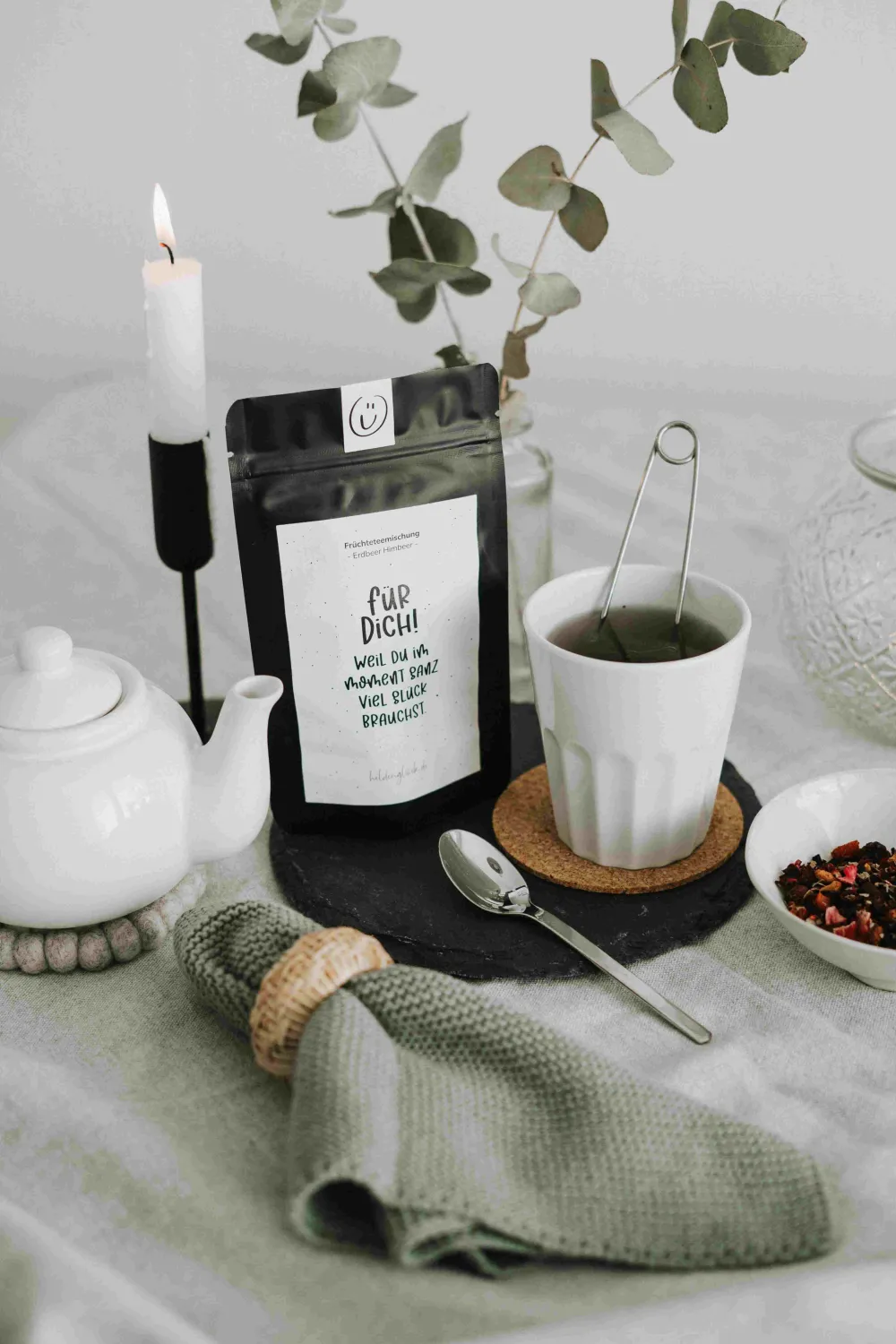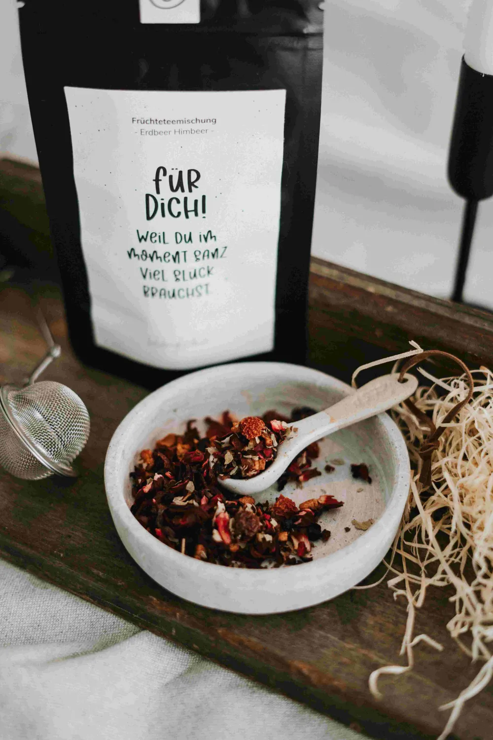 Mit dem Glück ist das so eine Sache – manchmal hat der eine jede Menge davon und die andere keins… Dagegen kann ein fruchtiger Tee wie dieser vielleicht nicht viel ausrichten – dennoch sendet er ein wichtiges Zeichen: Die Person, die ihn erhält, ist nicht alleine. Denn Du denkst an sie und sorgst Dich um sie. Und das ist schon ein ganz schön großes Stück Glück! TeeFrüchteteemischung · Erdbeer HimbeerZutaten: Hibiskusblüten, Hagebuttenschalen, Apfelstücke, Fliederbeeren, Brombeerblätter, Aroma, gefr.-getr. ganze Brombeeren, gefr.-getr. Erdbeer- und Himbeerstücke.Zubereitung: Übergieße 1-2 TL Tee mit kochendem Wasser in einer Tasse (250 ml). Die optimale Ziehzeit beträgt 10-12 Minuten.Dieser Tee ist Vegan und GlutenfreiInhalt: 35g