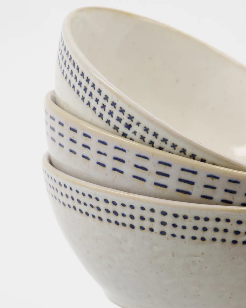 Diese wunderschöne Steingutschale ist perfekt für Frühstück, Suppen und Snacks und verleiht Ihrer Küche zusätzliche Eleganz. Sie besitzt eine cremeweiße Glasur und aufwendige Stickmuster. Jede Schale ist handgefertigt und somit einzigartig.- Handgefertigtes Steingutdesign- Einzigartige Farbvariationen- Geschliffene Bodendetails- Set mit drei Farben
