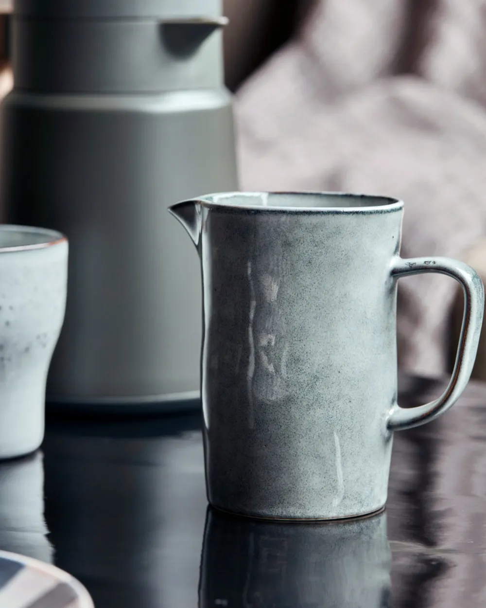 Ein kleines Kännchen für Milch oder Saucen ist das i-Tüpfelchen auf deinem gedeckten Tisch. Diese kleine Steingut-Kanne (300 ml) von House Doctor heißt Rustic und präsentiert sich in einer graublauen Glasur mit einem dunklen Kontraststreifen. Der große Henkel rundet das harmonische Design gekonnt ab. Die zeitlose Kanne eignet sich wunderbar sowohl für die Kaffeepause am Nachmittag als auch als Saucenbehälter für ein ungezwungenes Abendessen. Da sie mikrowellengeeignet ist, kannst du deine Sauce oder Milch problemlos aufwärmen. Decke den Tisch mit weiterem Geschirr aus der Rustic-Kollektion oder mit ähnlichen Tönen, um ein perfekt abgestimmtes Tischgedeck zu erhalten. Aufgrund der Beschaffenheit der Glasur und Oberfläche, kann es im Laufe der Zeit zu Kratzern kommen. Das unterstreicht jedoch nur den rustikalen Charme des Rustic-Designs.Größe: l: 11.7 cm, h: 12 cm, w: 8 cmInhalt: 43 ClMaterialen: Hauptsächlich: Steinzeug (100%)Lebensmittelecht: YesKann variieren: Beenden, FarbeNettogewicht: 0.35 kgTaragewicht: 0.07 kgBruttogewicht: 0.43 kgMicrowave: Approved for microwaveOven: Not approved for oven, Max temperature ArrayDishwash: Dishwasher safe, Max temperature Array