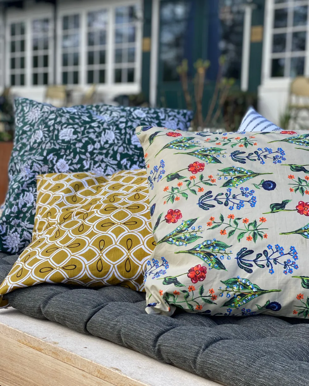 Eine schnelle, farbenfrohe und mühelose Erfrischung deiner Couch und Einrichtung als Ganzes. Dieser Kimi-Kissenbezug aus Baumwolle ist von House Doctor und hat einen weißen Blumendruck auf dunkelgrünem Hintergrund. Lässt sich prima mit anderen Mustern und Farben mischen und du kannst nach Lust und Laune ein einzelnes Kissen austauschen.