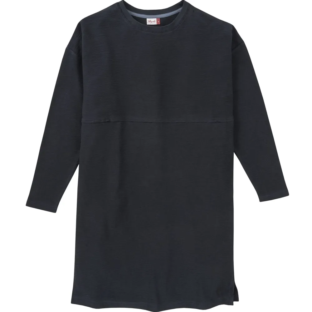 Sweat-Kleid Langarm in nachtblau, Midi-Länge, gerade Silhouette und überschnittene Schultern, offene Kante am Ausschnitt und Quernaht auf Unterbrusthöhe; seitliche Eingriffstaschen; kleine Seitenschlitze am unteren Saum.100% Baumwolle aus kontrolliert biologischem Anbau | „organic“ gem. GOTS | zertifiziert durch Ecocert Greenlife, Liz. Nr. 151811