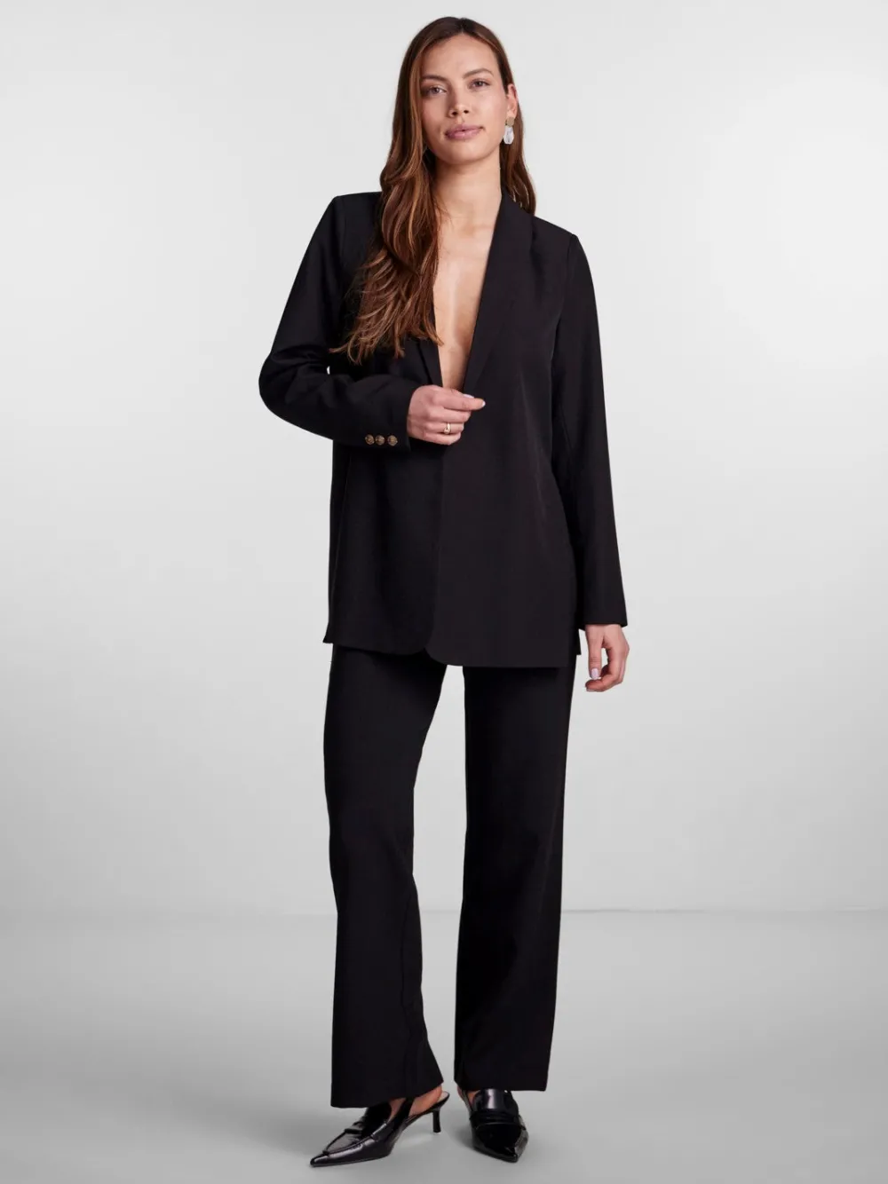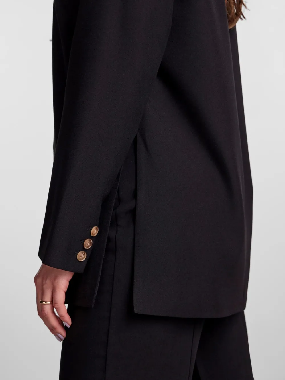 Einreihiger Blazer- Schalrevers- Haken- und Ösenverschluss- Lange Ärmel mit Knopfreihe an den Manschetten- Seitenschlitz- Länger als die Standardlänge.95% Polyester, 5% Elastane