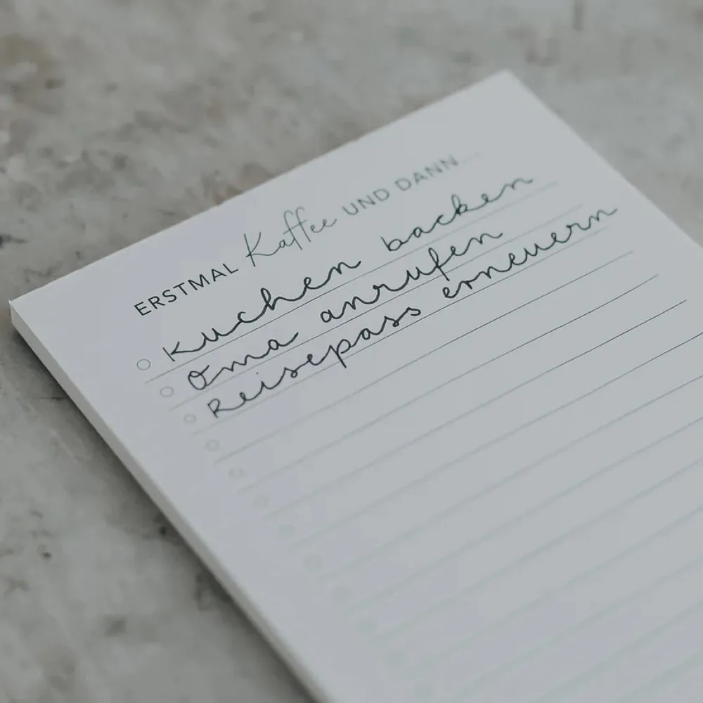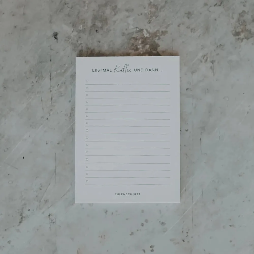 Der Kaffee am Morgen ist einfach ein absolutes Muss. Für alle, die danach gerne ihren Tag planen, ist unser neuer Notizblock ein hilfreicher Begleiter am Morgen.Der Block „Erstmal Kaffee und dann…“ ist perfekt für eure morgendlichen Notizen und mit der praktischen Liste ein toller Helfer für einen strukturierten Start in den Tag. Das handliche Format bietet ausreichend Platz für eure Notizen, Listen und Gedanken, ohne dabei zu viel Platz auf eurem Schreibtisch einzunehmen.Der Notizblock eignet sich auch hervorragend als Geschenk für alle, die Notizen lieben.Die 50 Blätter sind mit einer stabilen Leimbindung zusammengehalten, die ein einfaches und sauberes Abtrennen ermöglicht. Das handliche Format von 10,5 x 14,8 cm bietet genau den richtigen Platz, um all eure Notizen zu notieren. Die Rückseite des Notizblocks ist mit einer stabilen Pappe verstärkt. Merkmale:50 BlattLeimbindungVerstärkte Rückwand aus PappeMaße:Format 10,5 x 14,8 cmMaterial:Weißes Papier