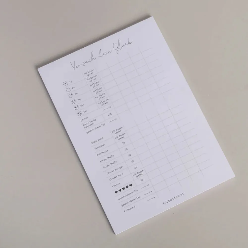 Liebst du es, dein Glück herauszufordern? Dann ist unser Versuch dein Glück Spielblock genau das Richtige für dich! Wir haben das klassische Kniffel-Spiel ein wenig umgestaltet und ihm unser einzigartiges Eulenschnitt Feeling verliehen. Perfekt für Spielabende oder ein kurzweiliges Match beim Kaffee-Date.Diese Spielblöcke sind nicht nur eine großartige Ergänzung für deine Papeterie-Sammlung, sondern auch das perfekte Geschenk für alle, die Spiele lieben. Hol dir jetzt das Eulenschnitt Feeling in Form von spannenden Spielen!Merkmale:50 BlattLeimbindungVerstärkte Rückwand aus PappeMaße:Format DIN A5 (14,8 x 21 cm)Material:Weißes Papier mit schwarzem Print
