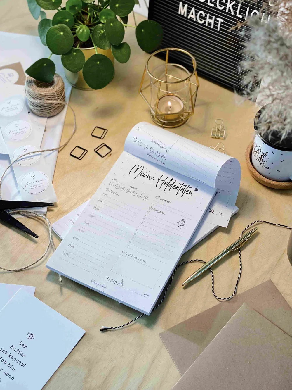 Ach, der Alltag… Manchmal kann er einen schon ziemlich durcheinander bringen. Doch dank Heldenglück sieht mal wieder alles besser aus!Mit unserem Tagesplaner hast Du das Wichtigste im Überblick und damit im Griff: Termine und Tiefsinniges, To-Do-Listen und Tagträumerei haben auf dem individuell nutzbaren Abreißblock im A5-Format Platz.Ob Du den Tagesplaner mit Farben und Stickern im Stil eines Bullet-Journals gestaltest oder als Kritzelblock nutzt, täglich oder wann es gerade passt, für Dich alleine oder zum Teilen mit Deiner Familie – eines ist sicher: Er hilft, Gedanken zu sortieren und den Kopf frei zu bekommen für noch mehr schöne Dinge!Format: DIN A5 (148 mm breit, 210 mm lang)Material: weißes Naturpapier in 120g/qmUmfang: 50 Blatt