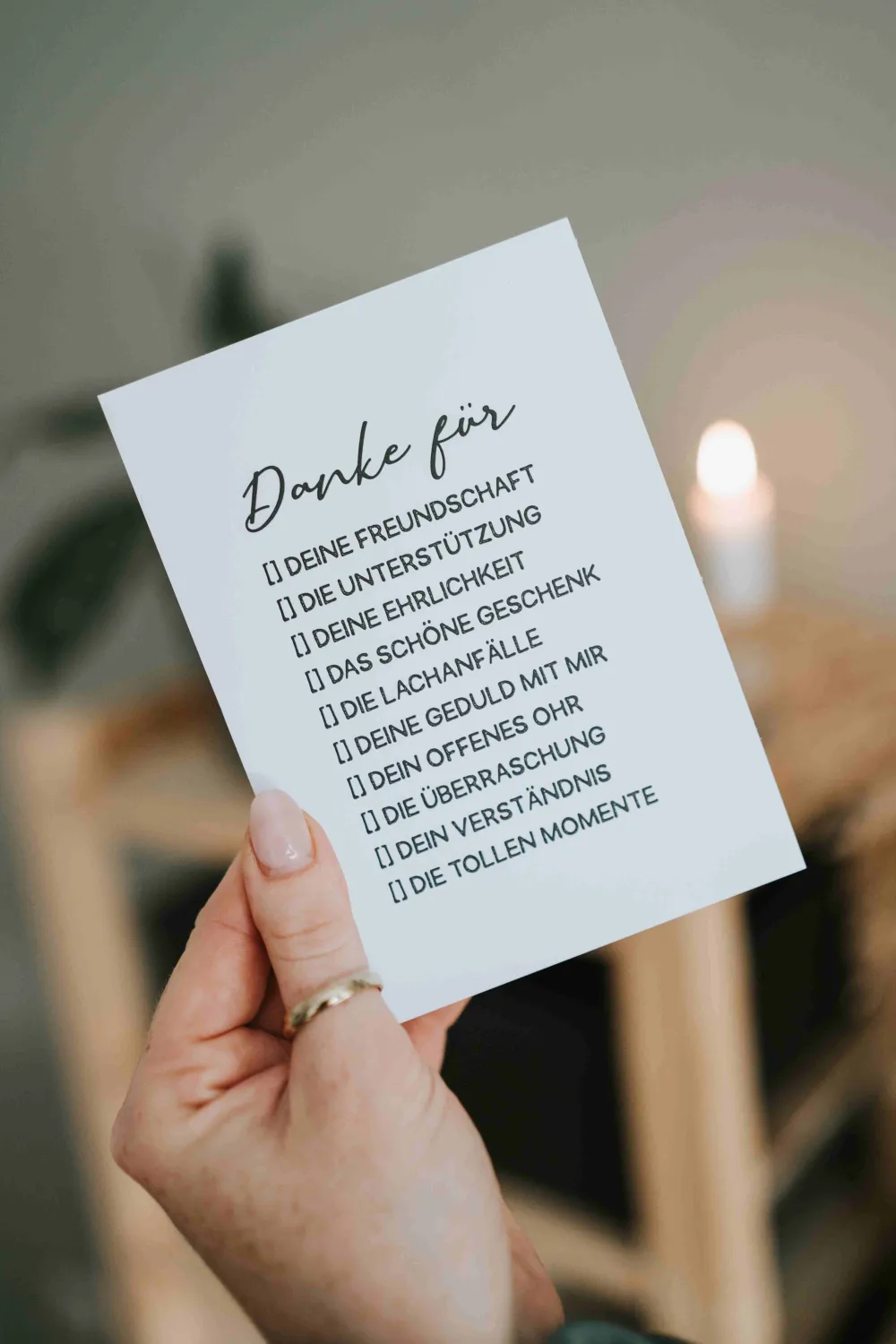 Unsere stilvolle Postkarte mit dem Spruch „Danke für“ bietet die Möglichkeit, individuell auszuwählen, wofür du danke sagen möchtest. Mit ankreuzbaren Optionen ist diese Karte das perfekte Geschenk, um deine Wertschätzung auszudrücken. Format: Hochwertige A6-Postkarte Material: 400g Naturpapier Aufdruck: „Danke für“ Universell: Tolles Geschenk für jedes AlterHergestellt aus nachhaltigen Materialien und mit modernem Design, bringt sie Freude und Dankbarkeit in den Alltag deiner Herzensmenschen.