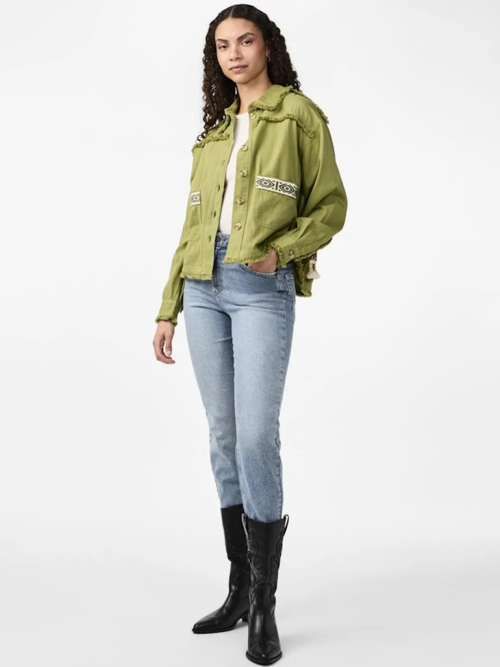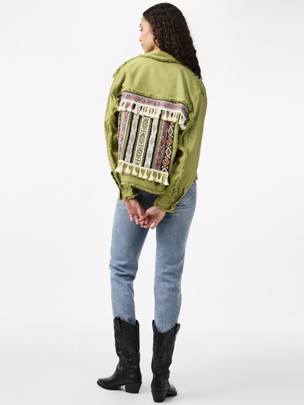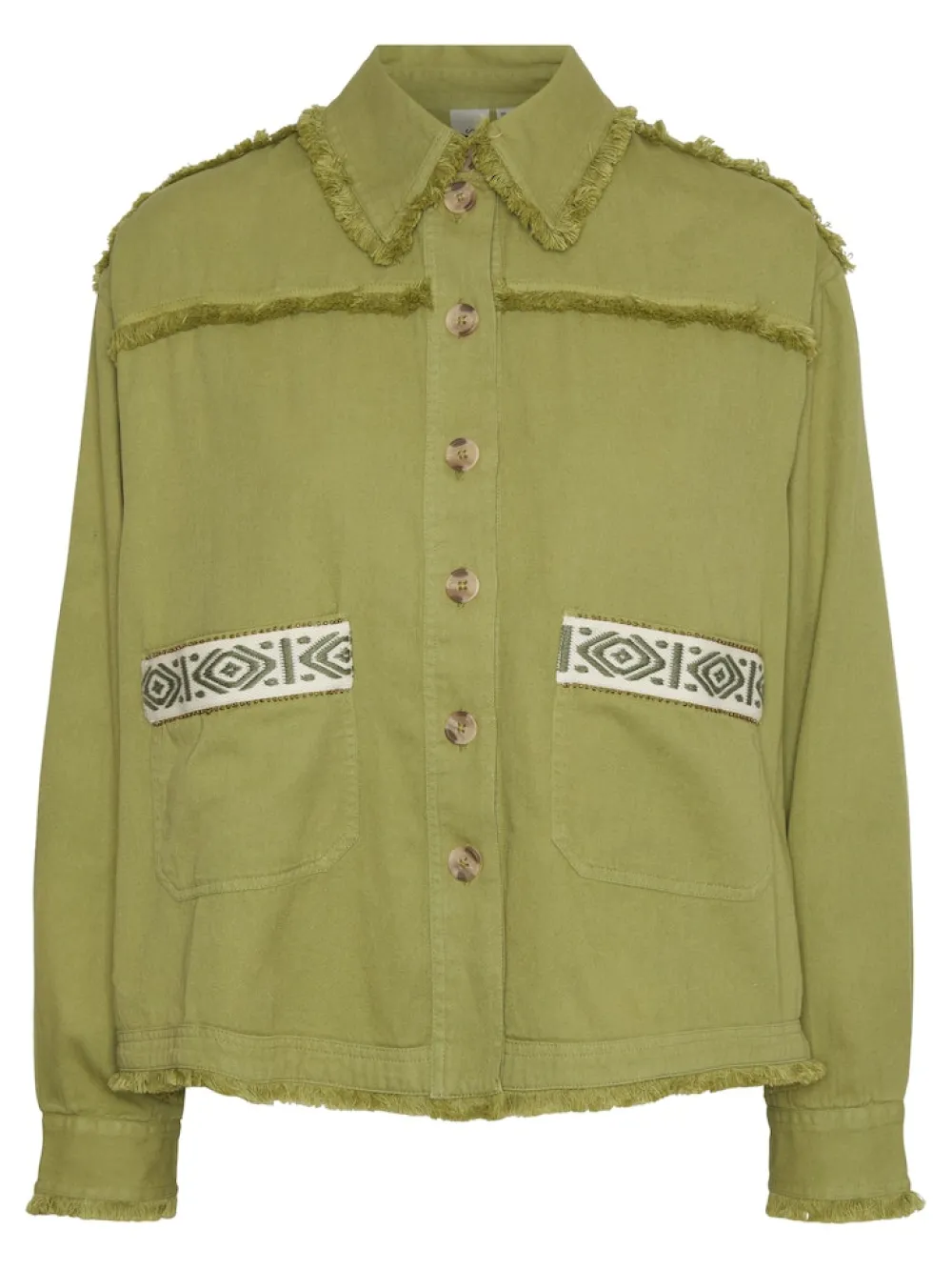 Kurze Jacke mit Stickerei- Hemdkragen mit Fransen- Geknöpfte Vorderseite- Fransen an Front- und Rückenpasse- Schultern…