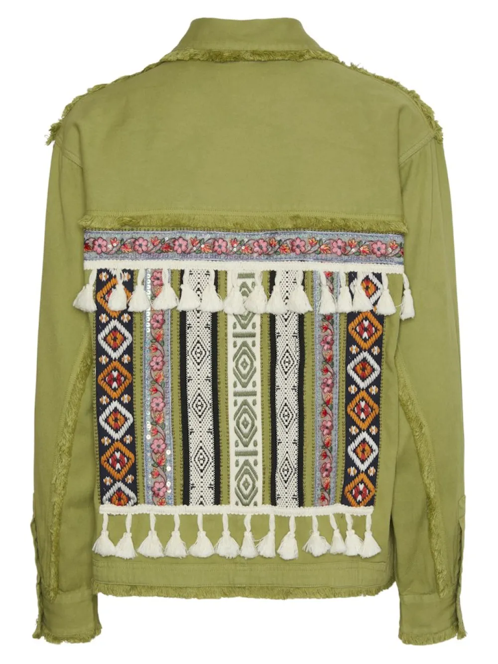 Kurze Jacke mit Stickerei- Hemdkragen mit Fransen- Geknöpfte Vorderseite- Fransen an Front- und Rückenpasse- Schultern mit Fransen- Lange Ärmel mit geknöpften Manschetten- Ärmelbündchen und Saum mit Fransen- Aufgesetzte Fronttaschen mit Stickerei- Bestickter Rücken mit Quasten und Pailletten- Regular Fit- Das Model trägt Größe M. Material: 100% Baumwolle
